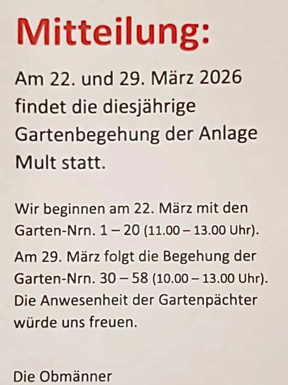 Liebe Gartenfreunde in der Anlage Mult!Am 22.03. sowie am 29.03.26 findet in der Gartenanlage Mult die diesjährige Gartenbegehung statt.Da diese mindestens 14 Tage vorher angekündigt ist, haben die Obmänner und weitere vom Vorstand beauftragte Personen das Recht, die Gartenparzelle auch in Abwesenheit des Pächters, zu betreten!