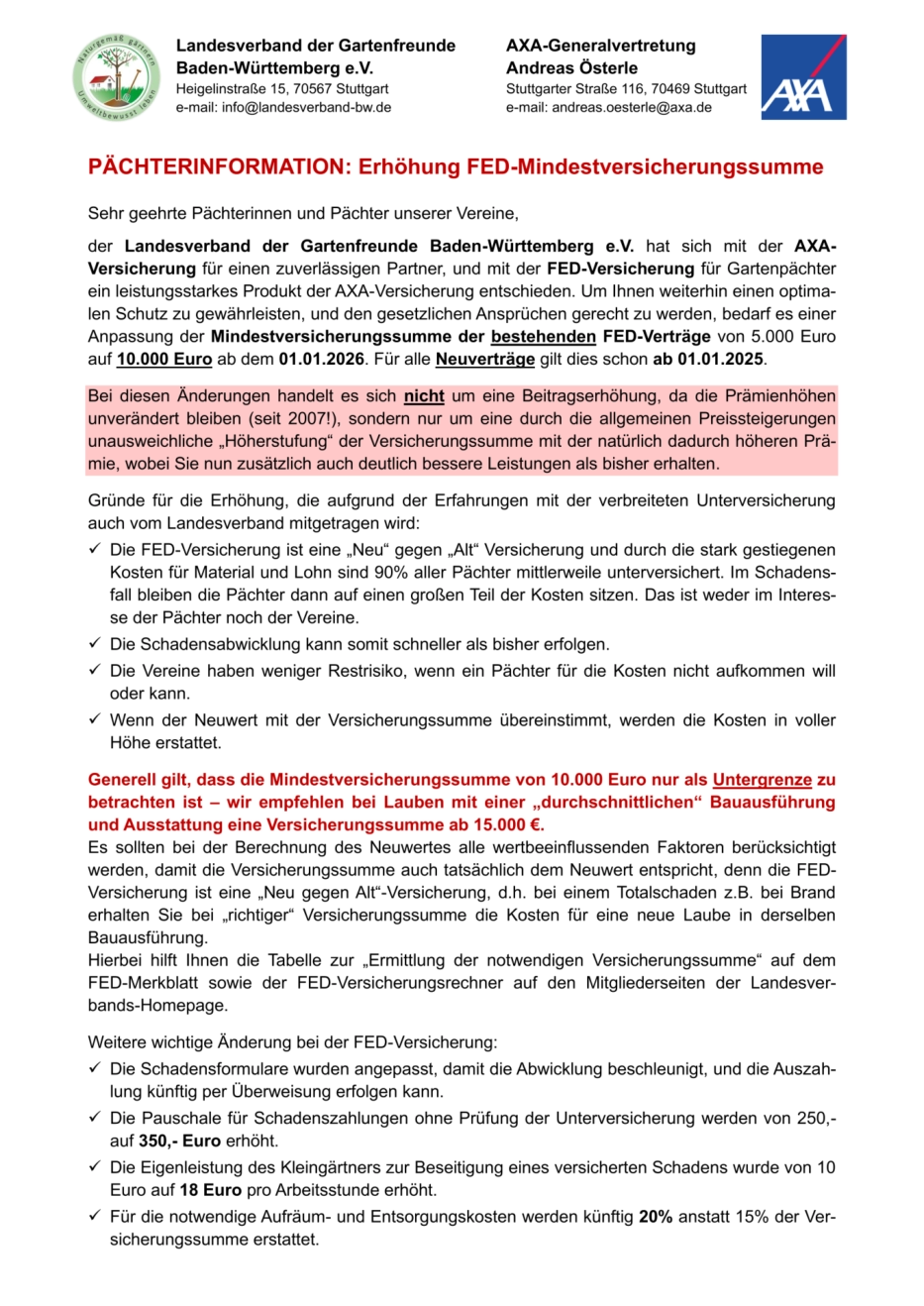 Sehr geehrte Gartenfreunde,bitte beachten Sie die beigefügte Informationsschreiben zur FED-Versicherung.Kurz zusammen gefasst:Die Versicherungssumme muss aufgrund der höheren Instandsetzungskosten im Schadensfall auf mindestens Euro 10.000 erhöht werden.Bestehende Verträge werden automatisch ab dem 01.01.2026 angepasst.Die Prämie wird sich dadurch NICHT erhöhen. Sollten Sie dieser Änderung trotz besserer Leistungen bei gleicher Beitragshöhe nicht wünschen, haben Sie bis zum 01.11.2025 ein Sonderkündigungsrecht.Mitglieder, welche das Sondernutzungsrecht nutzen möchten, oder Mitglieder, welche noch keinen Versicherungsschutz haben, wenden sich bitte an die eMail-Adresse keil@kgv-weinheim.de.MFGKGV Weinheim e.V.